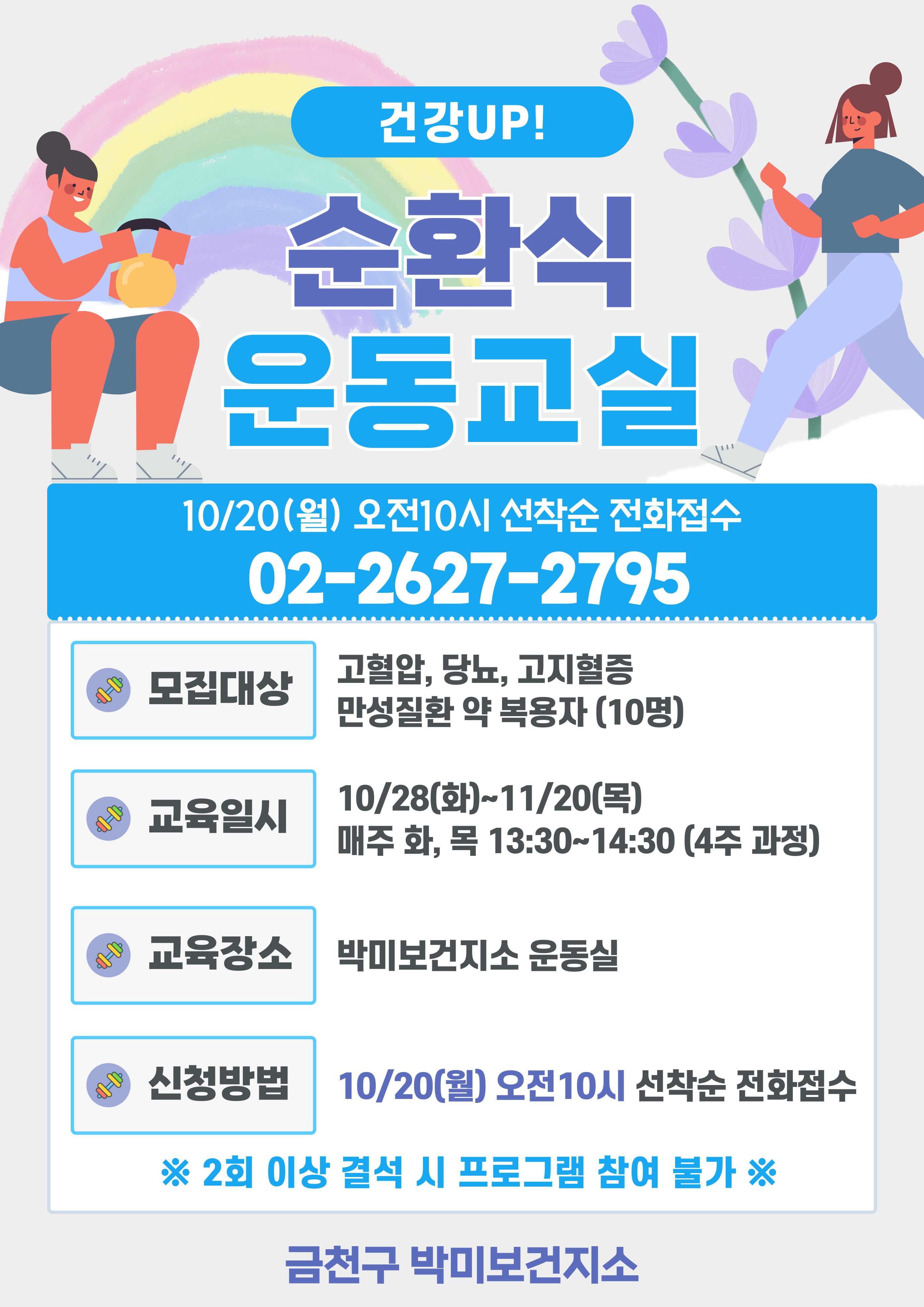 ○ 모집대상 : 금천구민 중 만성질환 약 복용자 10명 (65세이상 우대) ○ 모집방법 : 선착순 전화 접수 ○ 모집일시 : 2025년 10월 20일 월요일 오전 10시부터 ○ 운동장소 : 박미보건지소 2층 운동교육실 ○ 접수 및 문의사항 : ☎ 02-2627-2795 ○ 박미보건지소 네이버 밴드 : https://band.us/band/81836656/post/746