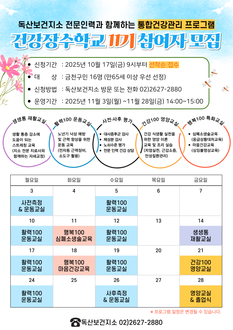 ✔ 신청기간 : 10월 17일(금) 09:00 부터 선착순 접수 ✔ 신청방법 : 독산보건지소 방문 또는 전화(02-2627-2880) ✔ 모집대상 : 금천구민 16명 *만 65세 이상 우선 신청 가능 ✔ 운영기간 : 11월 3일 (월) ~ 11월 28일 (금)