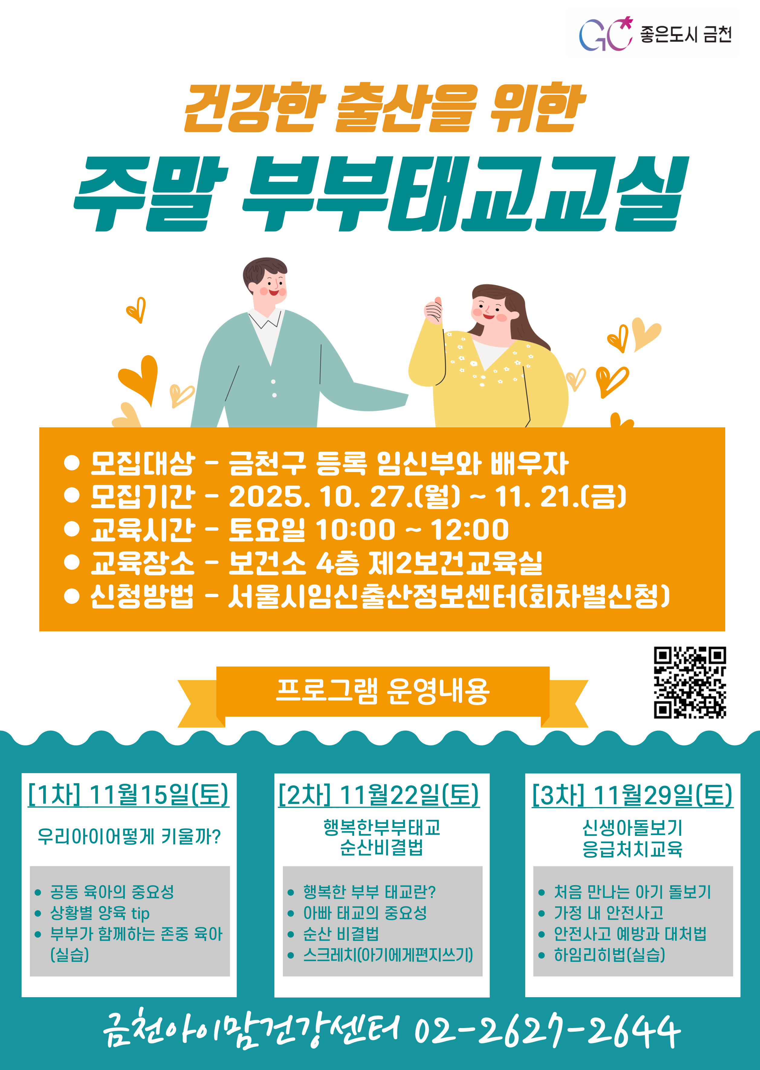 「주말 부부태교교실 2기」 프로그램 참여자 모집 ■ 강좌소개 : 부부가 함께 아이를 준비하는 부부태교교실 ■ 모집대상 : 금천구 등록 임신부와 배우자 10가정 ■ 교육일정 및 내용