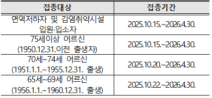접종기간 : 2025. 10. 15. ~ 2026. 4. 30. 접종대상 : 고위험군(대상자별 접종기간 상이) - 65세 이상 - 생후 6개월 이상 면역저하자 - 감염취약시설 입원·입소자