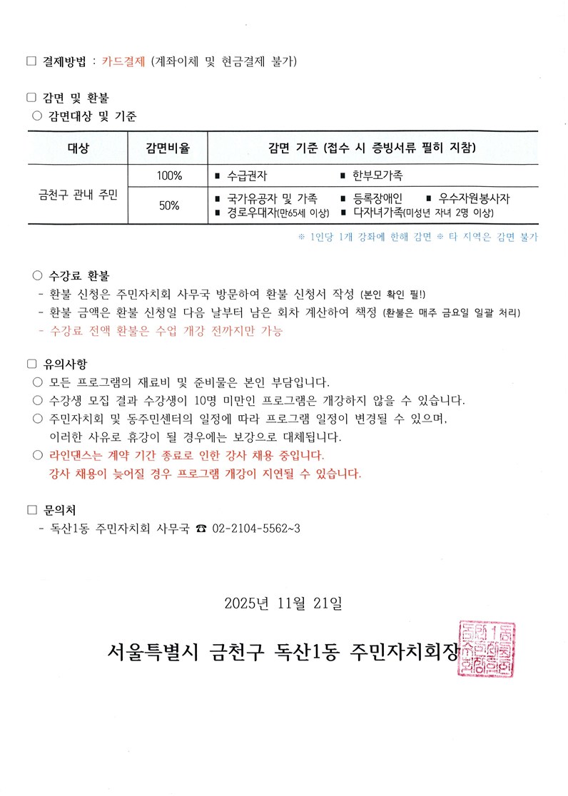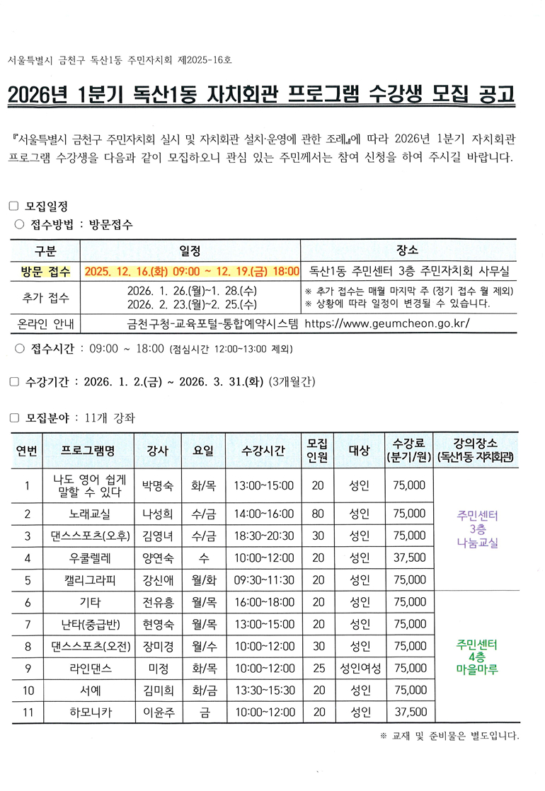 | 제목 | 2026년 1분기 독산1동 자치회관 프로그램 수강생 모집 공고 |