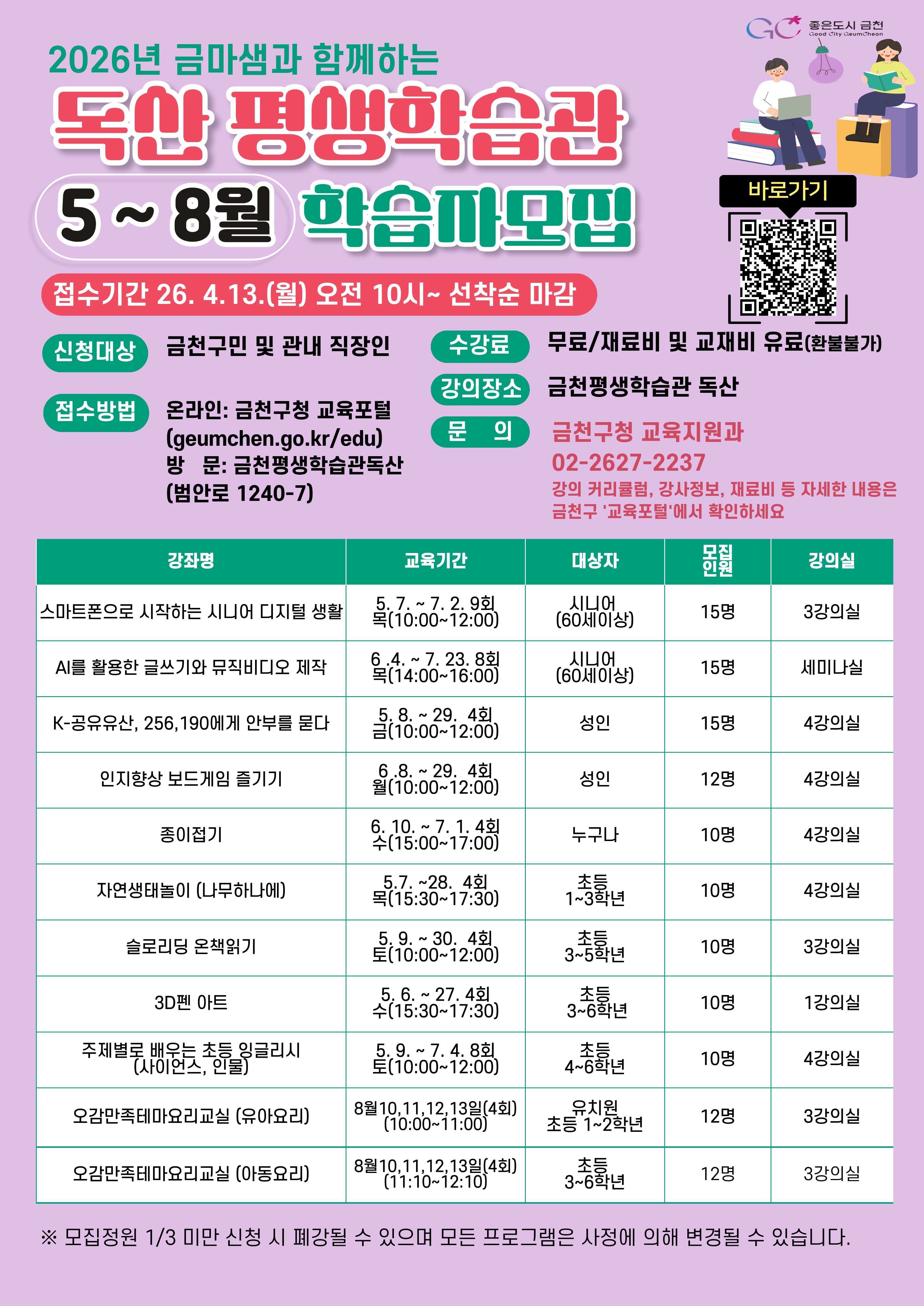 | 제목 | 2026년 금마샘과 함께 하는 독산평생학습관 5~8월 학습자 모집 |