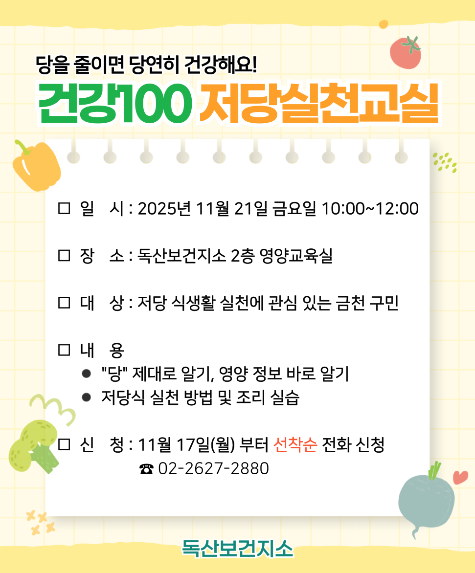 ✔ 일 시 : 2025년 11월 21일(금) 10:00~12:00 ✔ 장 소 : 독산보건지소 2층 영양교육실 ✔ 대 상 : 건강한 저당 식생활 실천에 관심 있는 금천구민 16명 (11월 4일 1차 참여자는 신청 불가) ✔ 내 용 : 저당 실천 식생활 영양 이론 및 조리 실습 ✔ 신 청 : 11월 17일 월요일 아침 9시부터 선착순 전화 전화 접수 02-2627-2880
