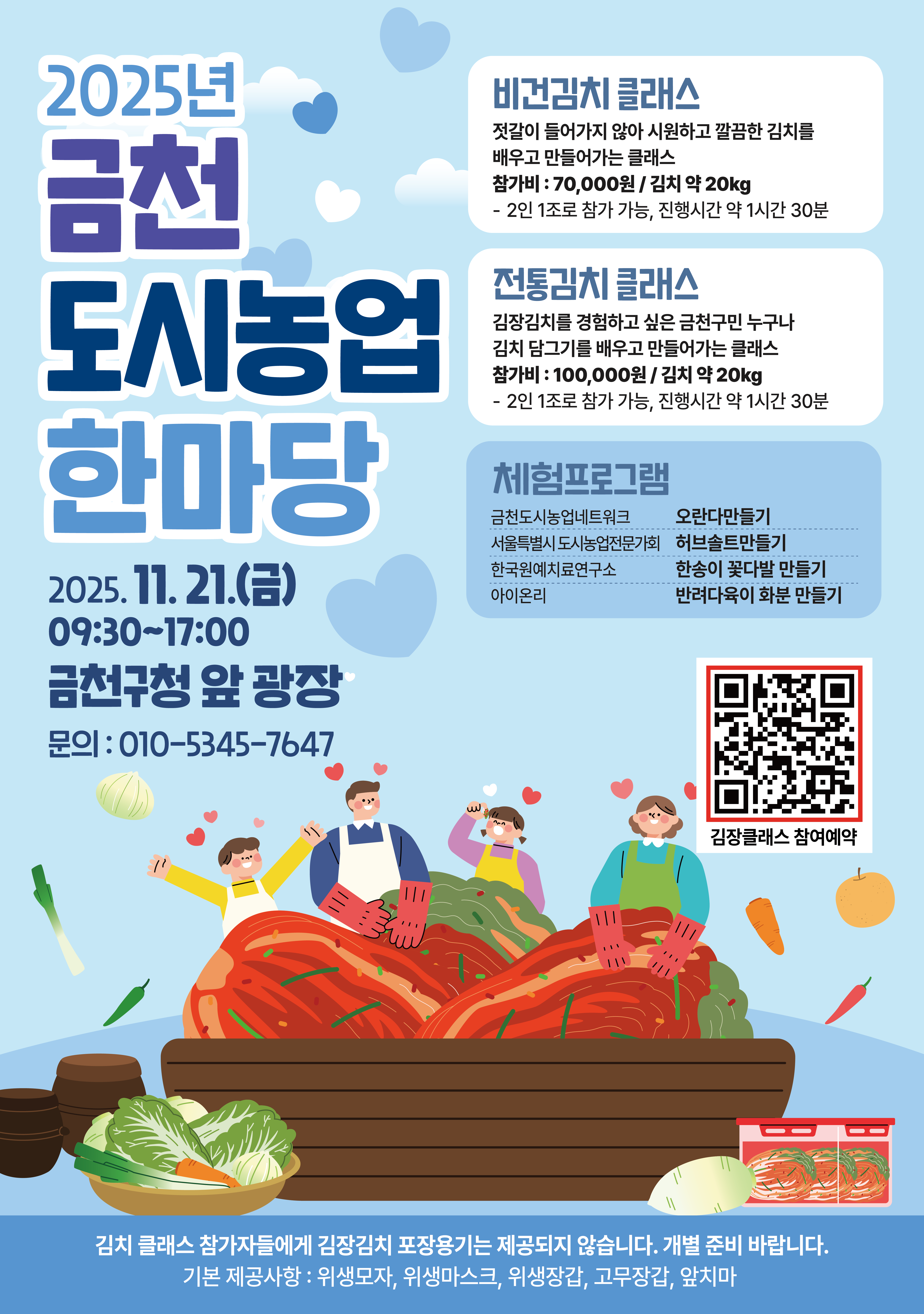 ♡11월 21일 가족과 이웃과 함께 김장김치 담그고 오란다 먹고 반려다육이 화분 만들어가세요 ◻ 일시 : 11월 21일(금) 09:30 ~ 17:00 ◻ 장소 : 금천구청 광장 ◻ 대상 : 금천구민 ◻ 내용 : 김치담그기 체험프로그램(사전예약 필요), 도시농업체험프로그램, 찾아가는 반려식물클리닉, 농산물 판매, 버스킹공연 등 ◻ 주요프로그램 운영시간