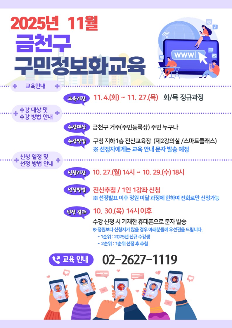 전산교육장 제2강의실(스마트클래스) 08611 서울특별시 금천구 시흥대로73길 70 금천구청 지하1층 |