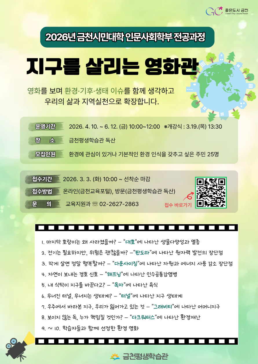평생학습관소식 홈 평생학습 평생학습관소식 점자뷰어보기 점자파일받기 인쇄 부가기능 토글 인스타그램 엑스 블로그 부가기능 닫기 [금천시민대학] 지구를 살리는 영화관 (인문사회학부 전공과정) 학습자 모집 상세보기 - 제목,조회수,담당부서,연락처,파일,내용,접수일 정보 제공 제목 [금천시민대학] 지구를 살리는 영화관 (인문사회학부 전공과정) 학습자 모집 조회수 72 담당부서 교육지원과 연락처 02-2627-2863 파일 접수일 2026.03.05 목록 이전글 [금천시민대학] Tiger 1 여행사-금천구, 어디까지 가봤니? (문화예술학부 전공과정) 학습자 모집 다음글 [금천시민대학] 청년 커뮤니티 리더 클래스 (인문사회학부 교양과정) 학습자 모집