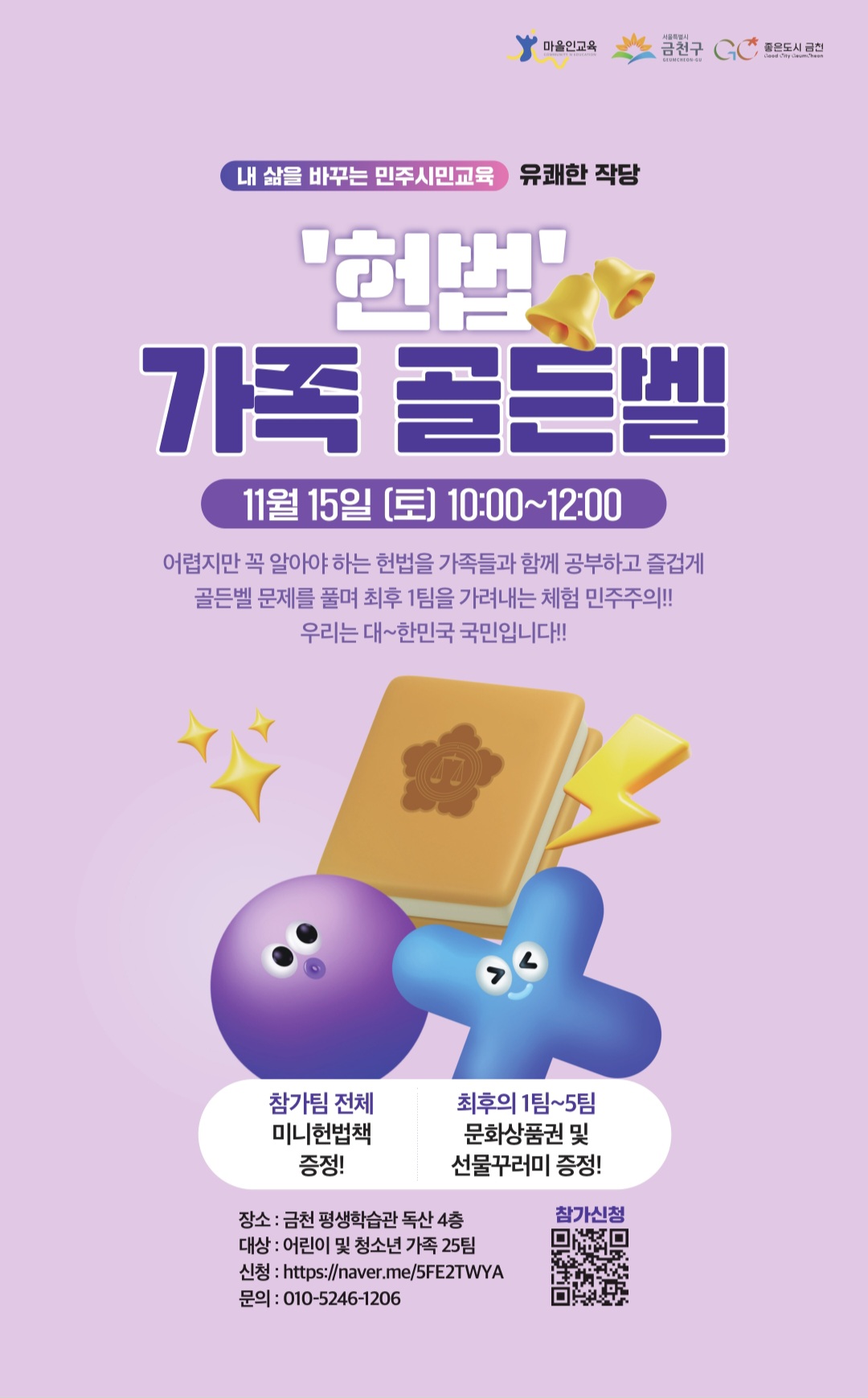 | 제목 | '헌법' 가족 골든벨(내 삶을 바꾸는 민주시민교육-유쾌한 작당) 참여자 모집 |