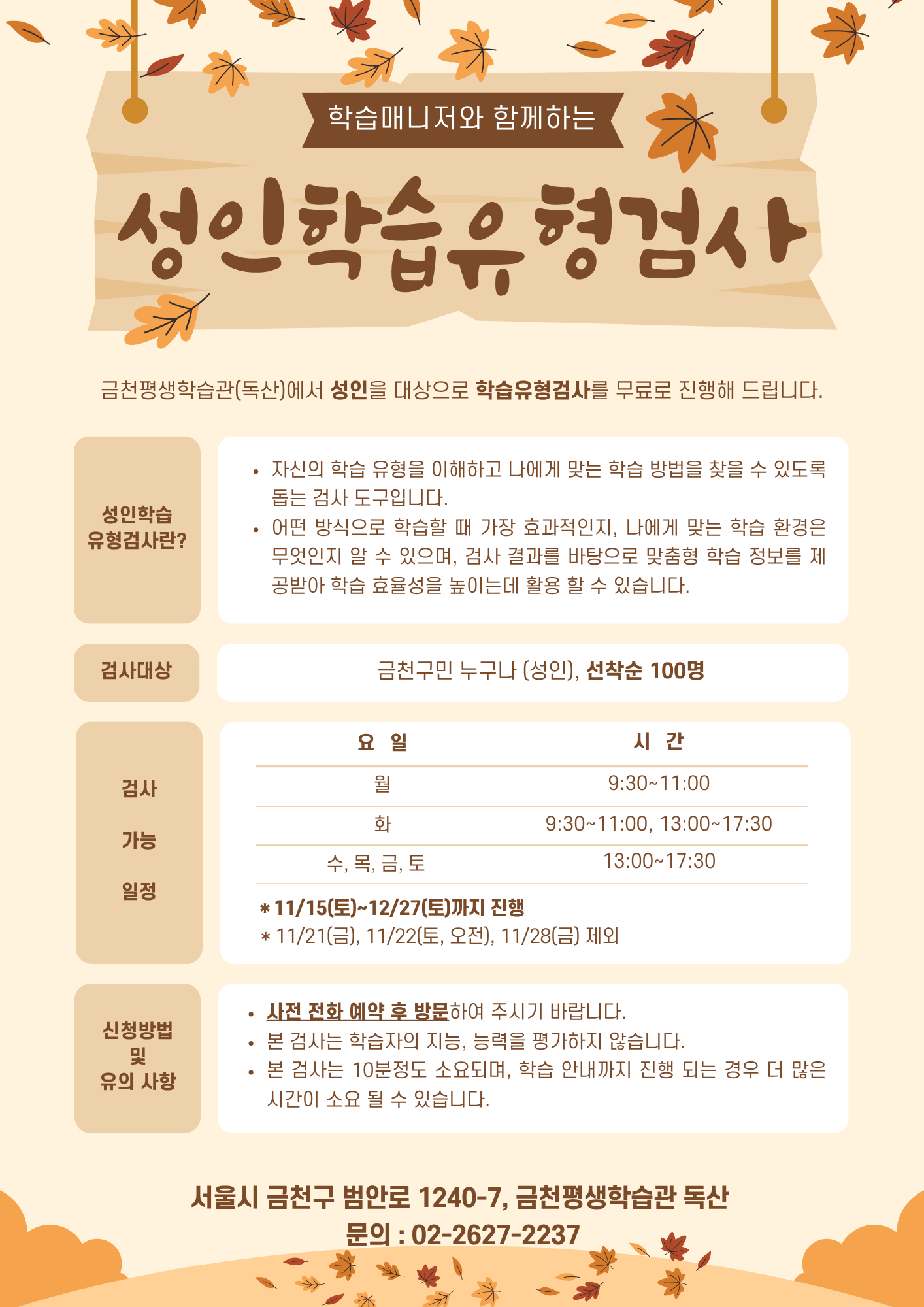 * 전화로 사전 예약 후 방문해 주세요! * 전화번호: 02-2627-2237 (금천평생학습관 독산)