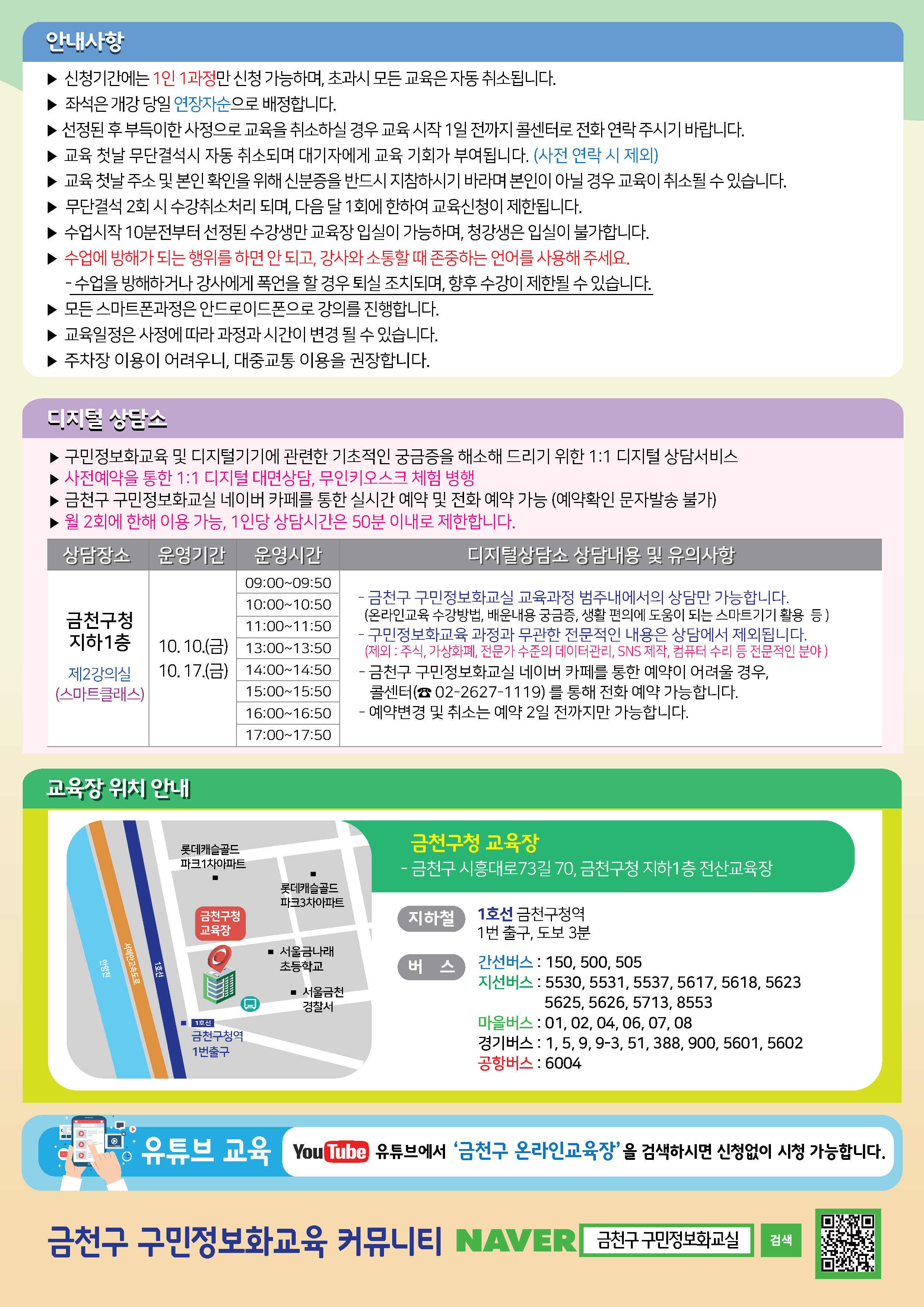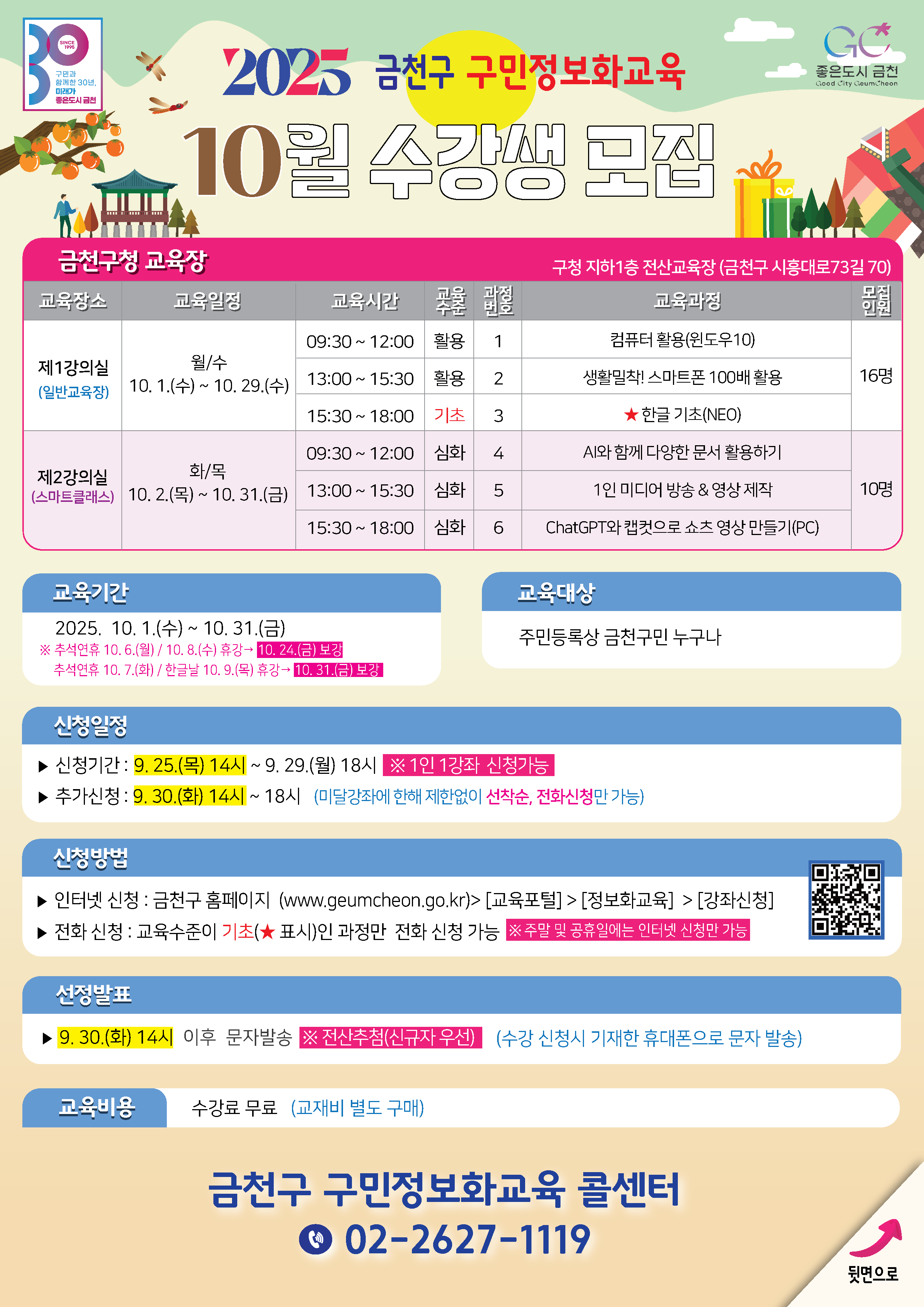 월별 교육일정 홈 평생학습 구민정보화교육 월별 교육일정 점자뷰어보기 점자파일받기 인쇄 부가기능 토글 인스타그램 엑스 블로그 부가기능 닫기 [2025년 10월] 구민정보화교육 안내 상세보기 - 제목,담당부서,내용,파일 정보 제공 제목 [2025년 10월] 구민정보화교육 안내 담당부서 소통담당관 파일 목록 이전글 [2025년 9월] 구민정보화교육 안내 다음글 [2025년 11월] 구민정보화교육 안내