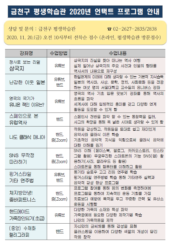 | 제목 | 금천구 평생학습관 2020년 언택트 프로그램 안내 |