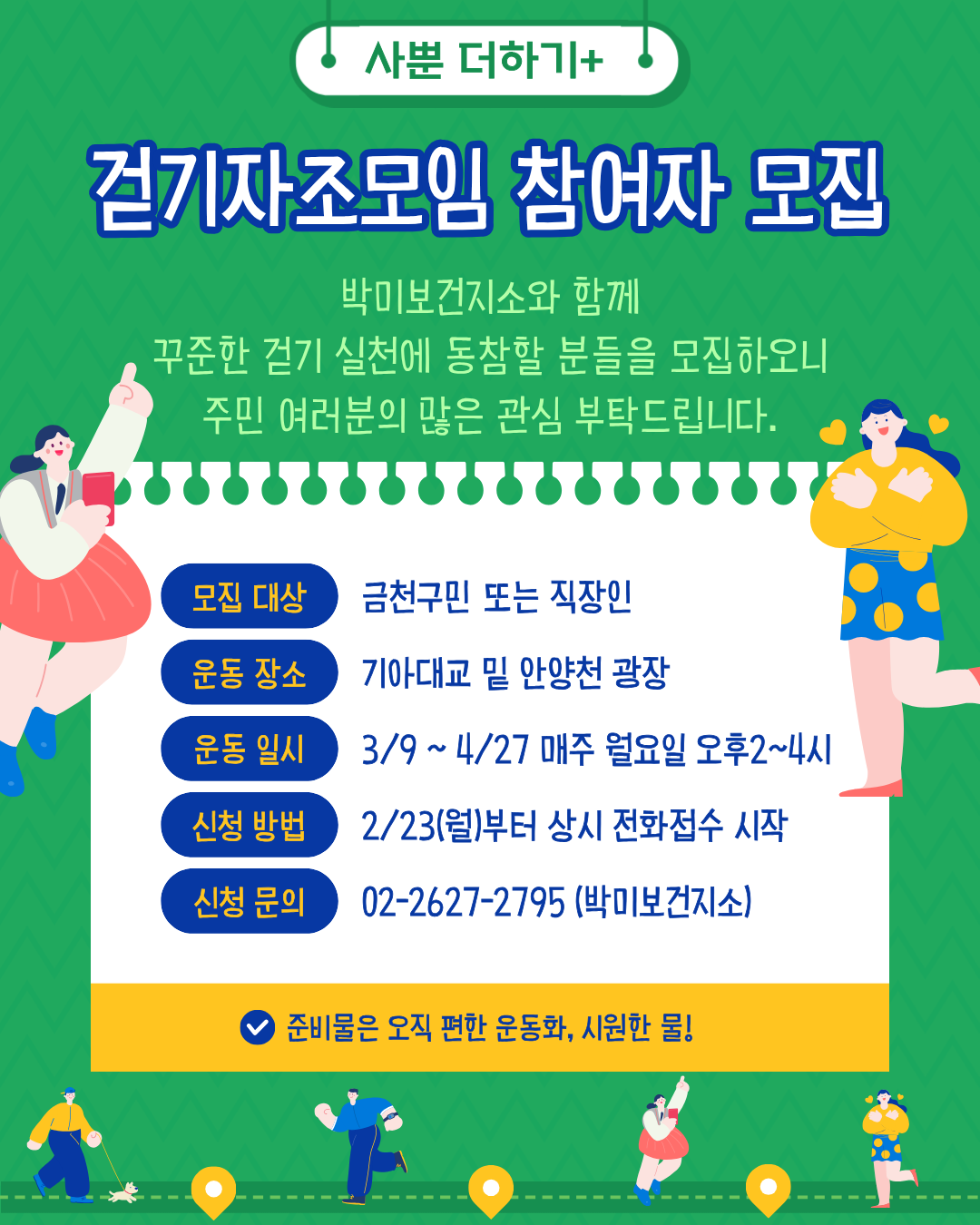 - 모집대상 : 금천구 주민 또는 직장인 - 모집일자 : 2026년 2월 23일(화) 오후 3시부터 접수 시작 (상시접수) - 문의사항 : ☎ 02-2627-2795 - 박미보건지소 네이버 밴드 : https://band.us/band/81836656/post/769