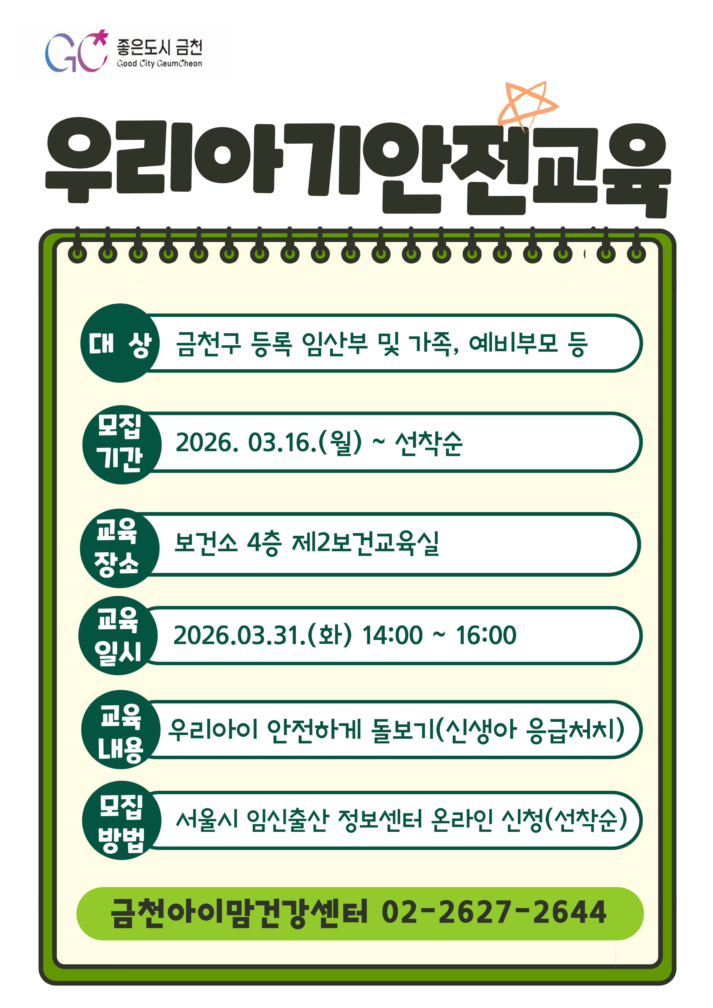 ■ 교육장소 : 보건소 4층 제2보건교육실 ■ 수 강 료: 무료 ■ 준 비 물 : 편한 복장 ■ 유의사항 1. 수업 시작 전 참석자 분 모두 개인정보동의서를 작성할 예정입니다.(개인정보동의를 하지 않을 시 수업참여에 제한이 있습니다.) 2. 원활한 수업 운영을 위해 수업 10분 전까지 참석해주시기 바랍니다. (참석이 어려우신 경우 미리 연락주시기 바랍니다.) 3. 신청일 이후 온라인 신청은 불가능하며 추가 신청을 원하실 경우 전화(☎02-2627-2644) 또는 방문(보건소4층) 바랍니다. (대기팀 3팀) 6. 문의사항은 금천아이맘건강센터(☎02-2627-2644)연락바랍니다.