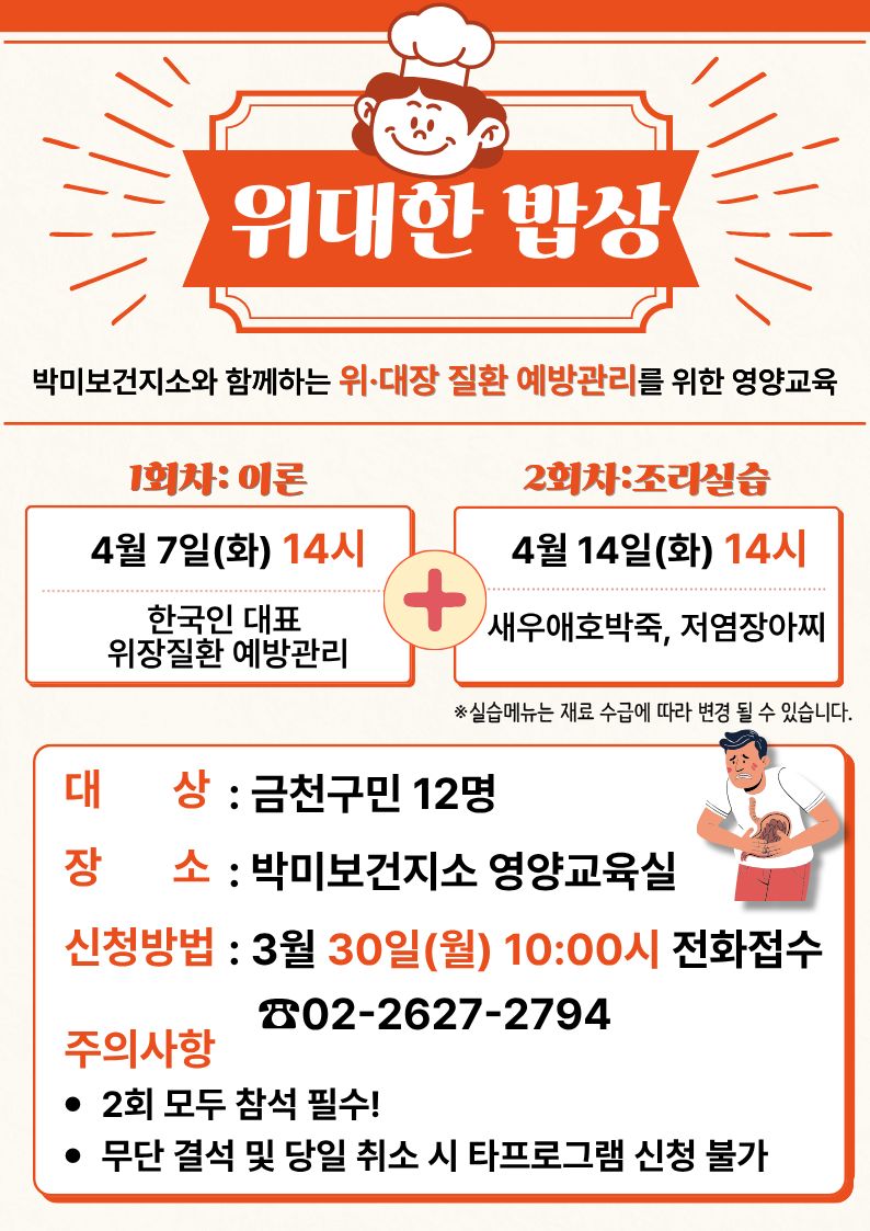 박미보건지소 위대한밥상 식생활 개선 조리교실 참여자 모집 장소: 박미보건지소 (시흥대로 12길 10-5 동네방네 마을이음센터 2층) 내용: 4월 7일(화), 14일(화) / 2회차 모두 참석 필수 대상 : 금천구민 모집방법: - 3월 30일일(목) 14시부터 전화접수(☎ 02-2627-2794)