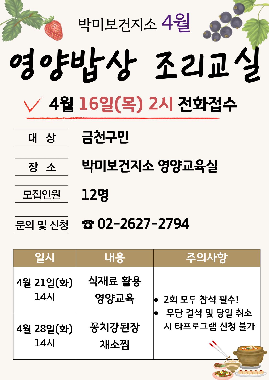 박미보건지소 4월 영양밥상 조리교실 참여자 모집 장소: 박미보건지소 (시흥대로 12길 10-5 동네방네 마을이음센터 2층) 내용: 4월 21일(화), 28일(화) / 2회차 모두 참석 필수 대상 : 금천구민 모집방법: - 4월 16일(목) 14시부터 전화접수(☎ 02-2627-2794)