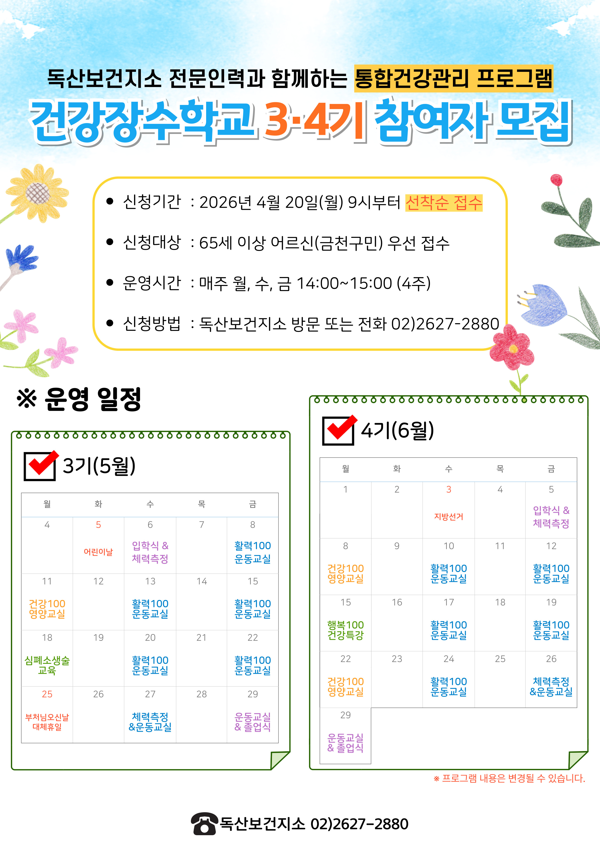안녕하세요. 2026년 독산보건지소 <건강장수학교 3·4기> 참여자를 모집합니다.