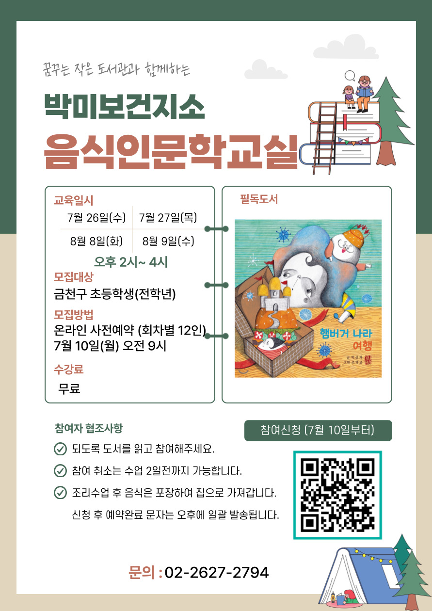 '박미보건지소 인문학교실' 참여자 모집안내 - 금천구 재학 초등학생 1~6학년 참여가능 박미보건지소 네이버밴드: https://band.us/n/a3a17cA0S4O5L(가입 시 새 게시물 알림을 빠르게 받으실 수 있습니다.)