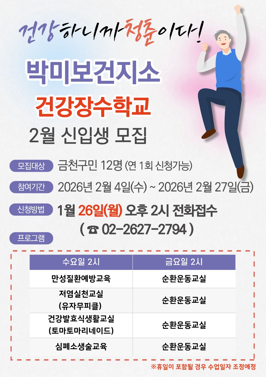 박미보건지소 건강장수학교 1기 참여자 모집 장소: 박미보건지소 (시흥대로 12길 10-5 동네방네 마을이음센터 2층) 내용: 매주 수, 금 2시 (총 8회 참여) 대상 : 금천구민 모집방법: - 1월 26일일(월) 14시부터 전화접수(☎ 02-2627-2794)