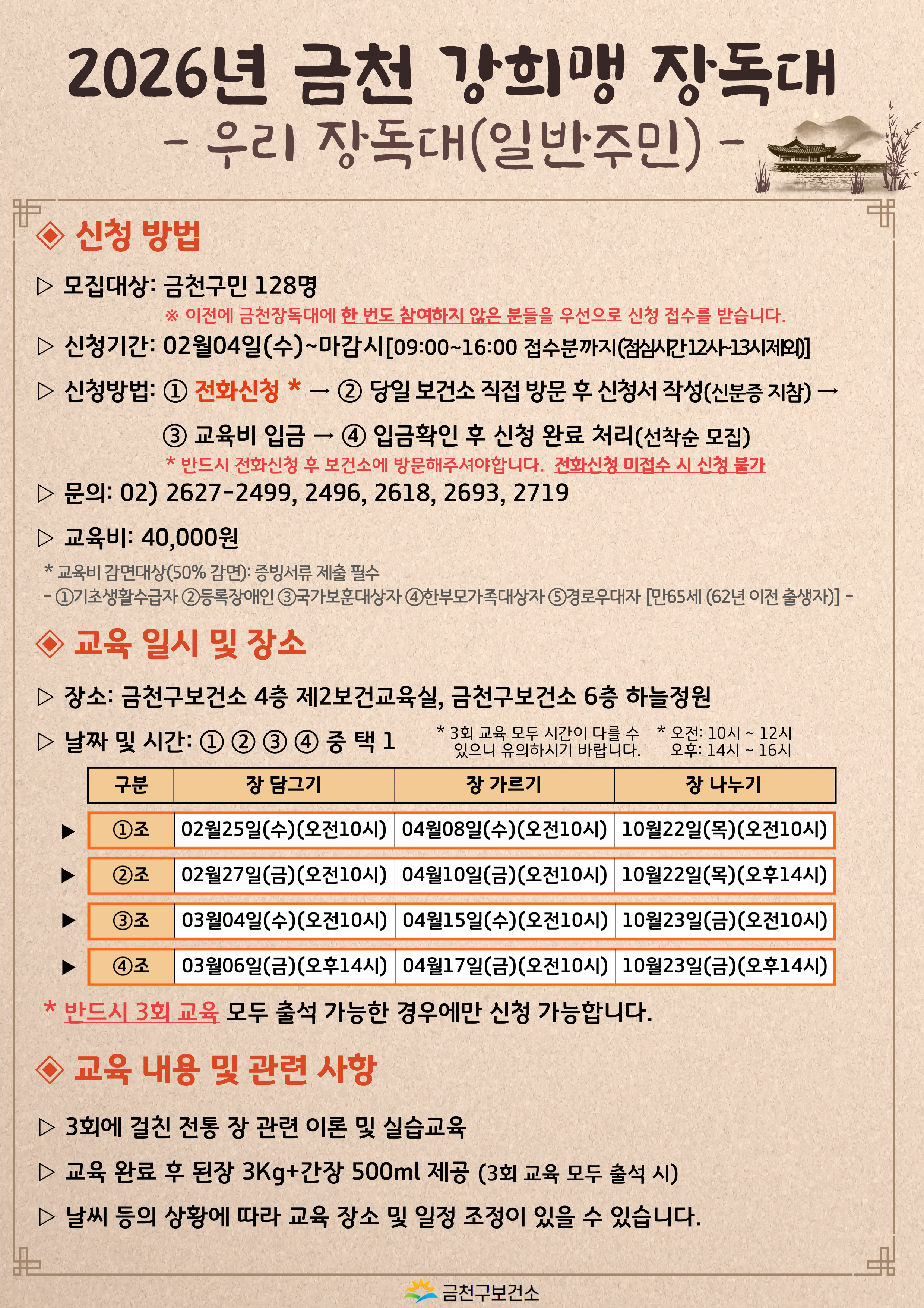 | 제목 | 2026년 금천 강희맹 장독대 신청 (일반주민) |