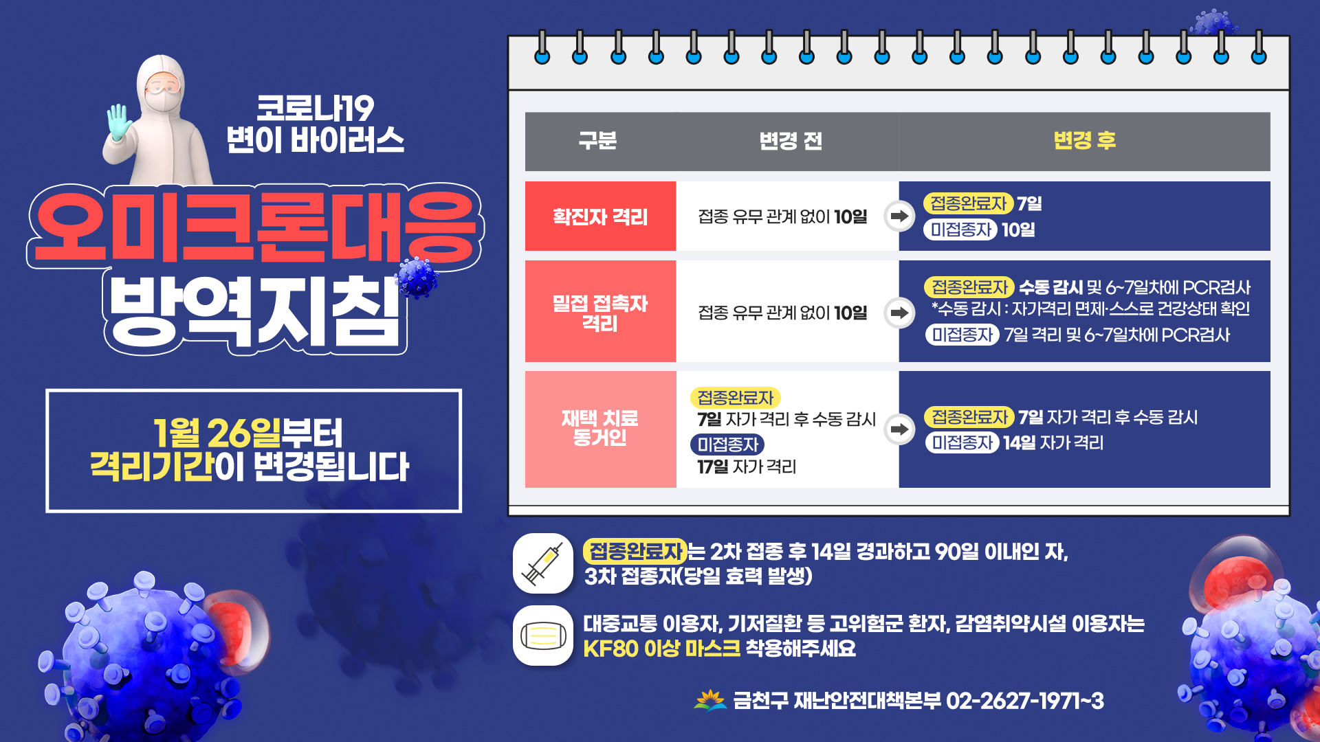 홍보자료 홈 보건사업 감염관리 코로나19 홍보자료 점자뷰어보기 점자파일받기 인쇄 부가기능 토글 인스타그램 엑스 블로그 부가기능 닫기 [1월 26일부터]오미크론 대응 방역 지침에 따른 격리기간 변경 안내 상세보기 - 제목,내용,파일 정보 제공 제목 [1월 26일부터]오미크론 대응 방역 지침에 따른 격리기간 변경 안내 파일 목록 이전글 금천구 선별진료소 및 임시선별검사소 운영시간 변경 및 설연휴 운영 안내 다음글 [2.3일부터~]코로나19 신속항원검사 실시 안내