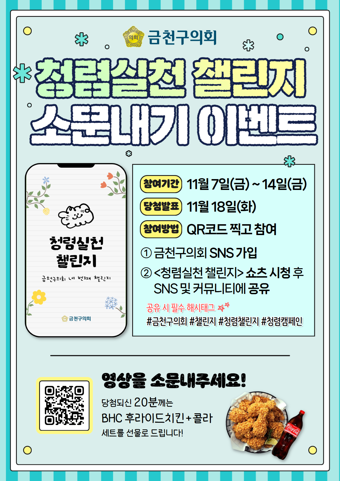 금천소식 홈 우리금천 금천소식 금천소식 점자뷰어보기 점자파일받기 인쇄 부가기능 토글 인스타그램 엑스 블로그 부가기능 닫기 금천구의회<청렴실천 챌린지> 소문내기 이벤트(~11/14) 상세보기 - 제목,조회수,담당부서,연락처,작성일,내용,파일 정보 제공 제목 금천구의회<청렴실천 챌린지> 소문내기 이벤트(~11/14) 조회수 39 담당부서 의회사무국 연락처 02-2627-2765 작성일 2025.11.07 ♥ 많은 참여 바랍니다 ♥ 파일 목록 이전글 2025년 서울가족학교 '아동기부모교실' 프로그램 신청 안내