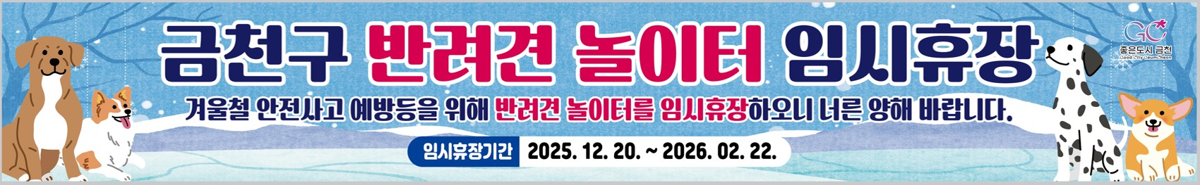 가. 임시휴장 개요 ○ 휴장기간 : 2025. 12. 20.(토) ~ 2026. 2. 22.(일) ○ 장 소 : 금천구 반려견 놀이터 (시흥동 784-21) ○ 대 상 : 관내 반려인 및 반려견 ○ 내 용 : 겨울철 미끄럼 등 안전사고 예방과 환경 정비를 위해 2025. 12. 20. ~ 2026. 2. 22. 간 금천구 반려견 놀이터를 임시휴장 ※ 중·소형견 놀이터, 대형견 놀이터, 반려견주 쉼터 등 전체 시설 ○ 문 의 처 : 지역경제과 동물복지팀 ☎ 02-2627-2594