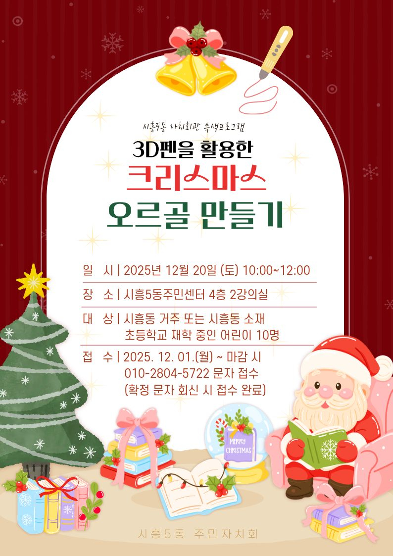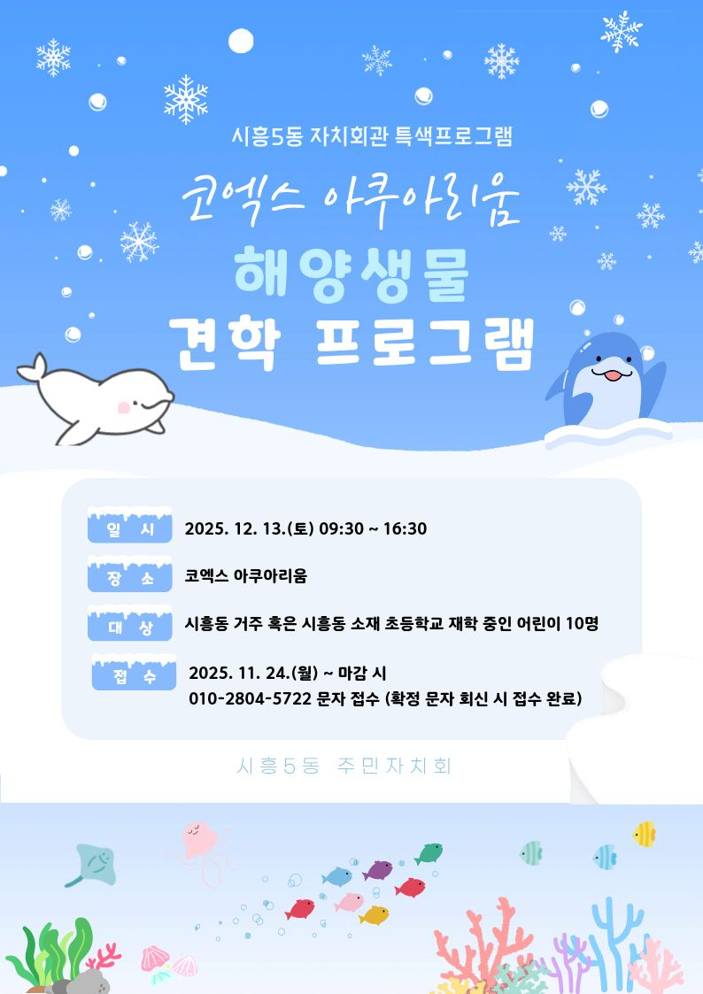 금천소식 홈 우리금천 금천소식 금천소식 점자뷰어보기 점자파일받기 인쇄 부가기능 토글 인스타그램 엑스 블로그 부가기능 닫기 시흥5동 자치회관 특색프로그램 참여자 모집 상세보기 - 제목,조회수,담당부서,연락처,작성일,내용,파일 정보 제공 제목 시흥5동 자치회관 특색프로그램 참여자 모집 조회수 52 담당부서 시흥5동 연락처 02-2104-5722 작성일 2025.11.20 파일 목록 이전글 (2026년 1분기) 독산4동 자치회관 프로그램 수강생 모집