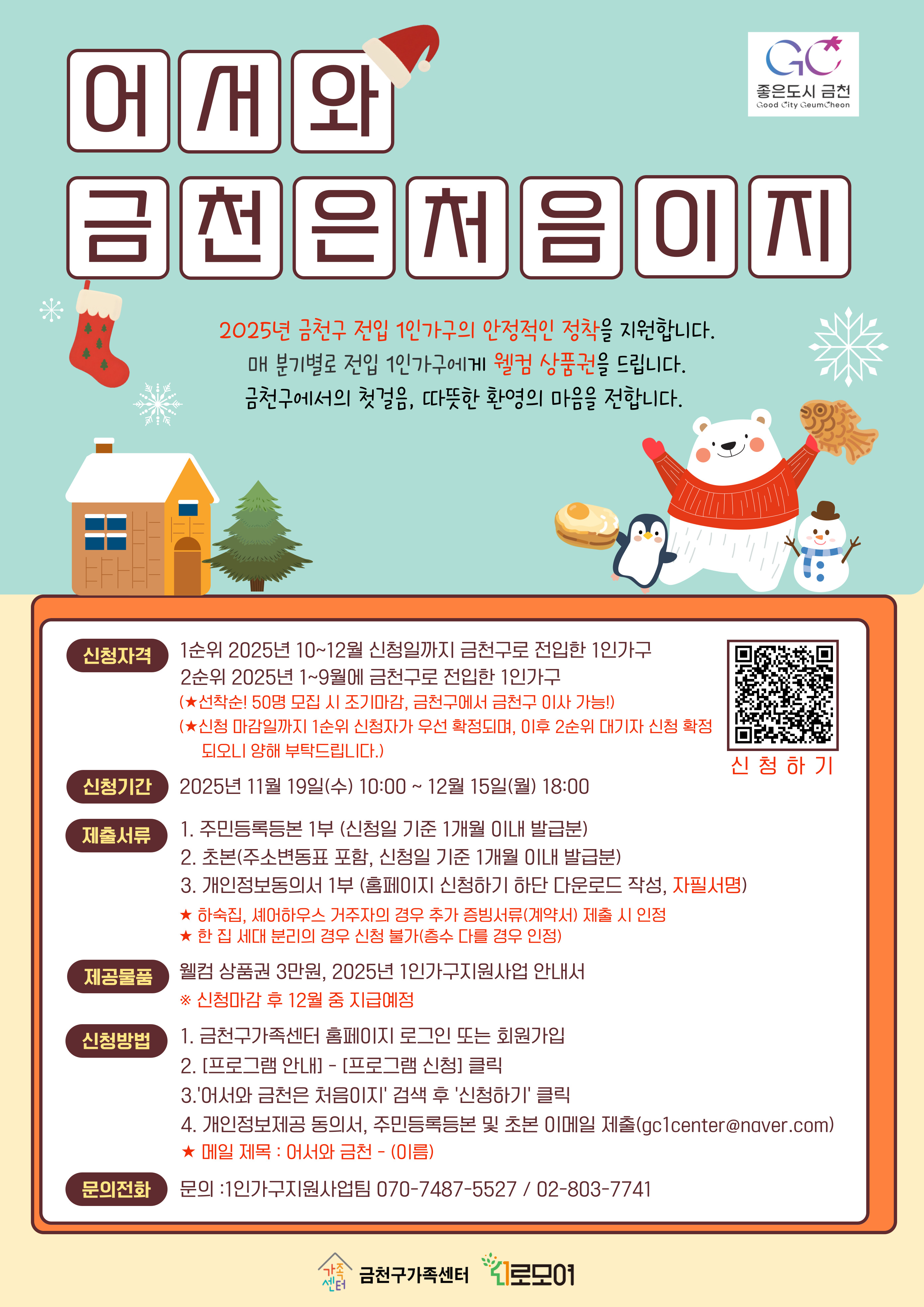 · 참여대상 : 1순위 2025년 10~12월 신청일까지 금천구로 전입한 1인가구 2순위 2025년 1~9월에 금천구로 전입한 1인가구 (★ 선착순! 50명 모집 시 조기마감, 금천구에서 금천구 이사 가능!) (★ 신청 마감일까지 1순위 신청자가 우선 확정되며, 이후 2순위 대기자 신청 확정 되오니 양해 부탁드립니다.) · 참여기간 : 2025년 11. 19.(수) 14:00 ~ 12. 15.(월) 18:00 2. 초본(주소변동표 포함, 신청일 기준 1개월 이내 발급분) 3. 개인정보동의서 1부(금천구가족센터 홈페이지 신청하기 하단 다운로드 작성) ★ 하숙집, 셰어하우스 거주자의 경우 추가 증빙서류(계약서) 제출 시 인정 ★ 한 집 세대 분리의 경우 신청 불가(층수 다를 경우 인정) · 제공물품 : 웰컴 상품권 3만원, 2025년 1인가구지원사업 안내서 ★ 신청 마감 후 12월 중 지급 예정 · 신청방법: ① 금천구가족센터 홈페이지 로그인 또는 회원가입 → ② [프로그램 안내]-[프로그램 신청] 클릭 → ➂ ‘어서와 금천은 처음이지’ 검색 후 ‘신청하기’ 클릭 → ➃ 주민등록등본 및 초본, 개인정보제공동의서 ★ 서류 이메일 제출 ( gc1center@naver.com ) ★ 메일제목 : 어서와 금천-(이름) ★ 개인정보동의서의 경우 금천구가족센터 홈페이지 하단 개인정보동의서 서식을 다운받아 작성해 주세요!