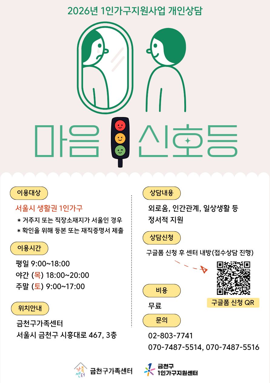 ▪접수기간 : 2026. 1. 15.(목) ~ 12. 31.(목) ※ 상시 접수 ▪사업대상 : 서울시 생활권 1인가구(서울시 거주 또는 직장소재지가 서울인 경우) ▪사업내용 : 생활 고민, 정서적 어려움, 가족 및 대인관계 등 ▪상담비용 : 무료(예산 소진 시까지) ▪신청방법 : 구글폼 신청 후 센터 내방을 통해 접수 진행