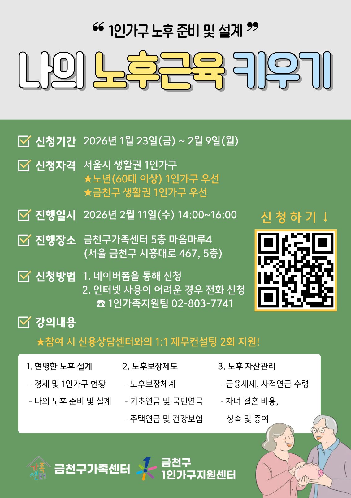 · 진행일시: 2026. 2. 11.(수) 14:00~16:00 · 장소: 금천구가족센터 5층 마음마루4(금천구 시흥대로 467, 5층) · 신청방법: 네이버폼 신청(신청링크: https://naver.me/xfYuACor) 인터넷 사용이 어려운 경우 전화 신청 ☎ 02-803-7741(1인가족지원팀)