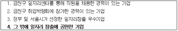 라. 우선선발기업 ① 「금천구 주민고용보조금 지원에 관한 조례」 제9조에 해당하는 기업 ※ 그 밖에 일자리 창출에 공헌한 기업 - 주민고용보조금 사업 신규 신청 기업 - 고용유지력이 높고 장기 고용이 보장되는 양질의 일자리 채용 기업 (단순 노무 종사자 고용 및 생계형 밀집 업종 기업보다 우선함) ② 서울서부 중장년내일센터 등 일자리 유관기관의 취업 연계 교육 수료자를 신규채용한 기업 ③ 2025년도 금천구 일자리창출 우수기업 인증서를 받은 기업