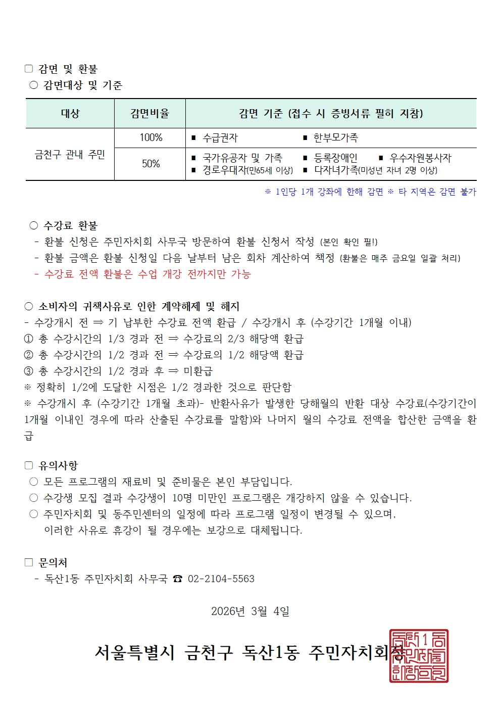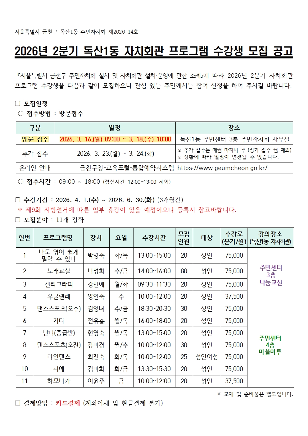 | 제목 | 2026년 2분기 독산1동 자치회관 프로그램 수강생 모집 공고 |