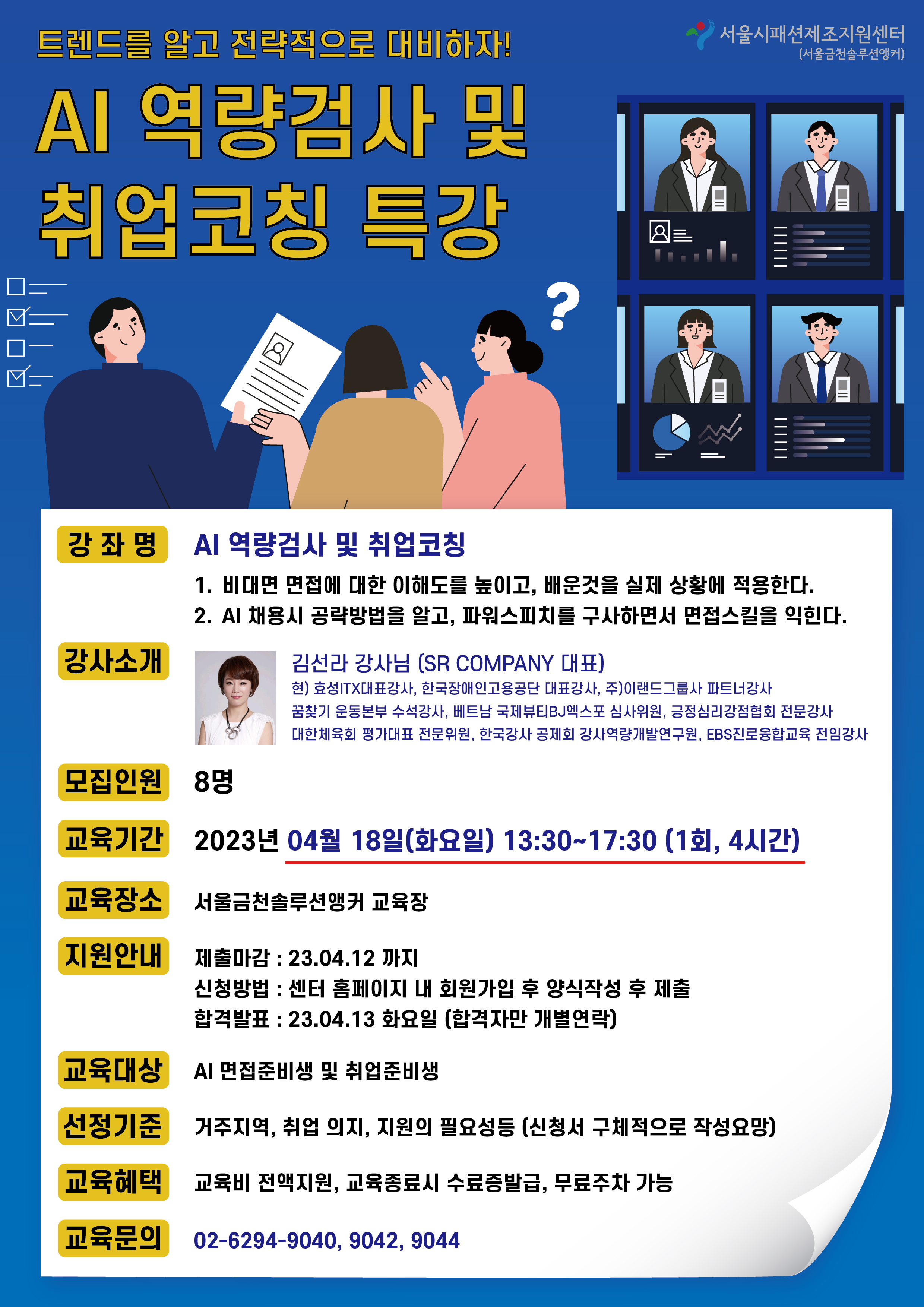 | 제목 | 서울패션스마트센터(금천솔루션앵커) AI역량검사 및 취업코칭 특강 안내 |