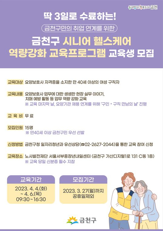 | 제목 | 금천구 시니어 헬스케어 역량강화 교육프로그램 교육생 모집 |