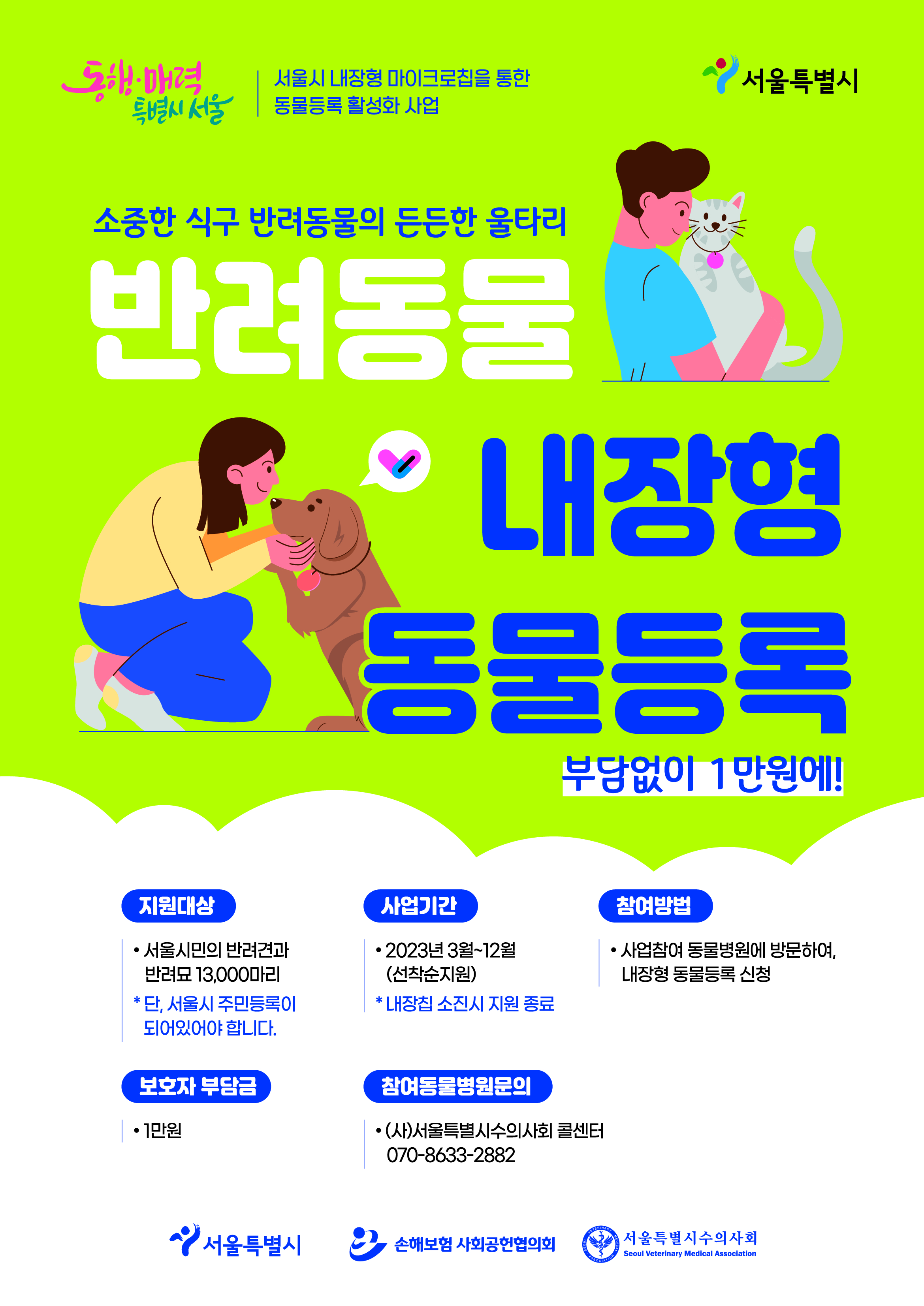 - 사업기간 : 2023. 3.~12. 31.(선착순 지원, 13,000마리분 소진 시 종료) - 지원대상 : 서울시민의 반려견 및 반려묘 13,000마리 - 참여방법 : 시민이 반려동물과 함께 사업참여 동물병원 방문, 내장형 동물등록 - 사업참여 동물병원 안내 : (사)서울특별시수의사회 홈페이지 및 콜센터 (070-8633-2882) - 등록비용 : 1만원 - 유의사항 · 서울시 주민등록 되어 있어야 함 · 사업참여 동물병원이 아니면 지원 불가