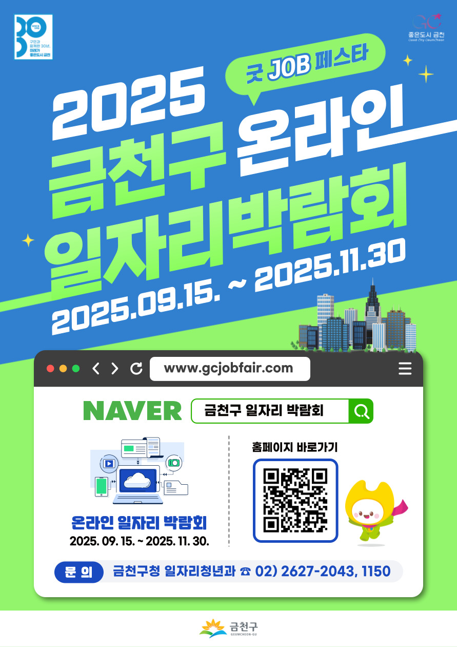 구민과 함께한 30년, 미래가 좋은도시 금천구에서 구직자에게 다양한 고용 정보와 취업 기회를 제공하기 위하여 “2025년 금천구 온라인 일자리박람회”를 운영합니다. 관심있는 구직자 분들의 적극적인 참여 부탁드립니다!