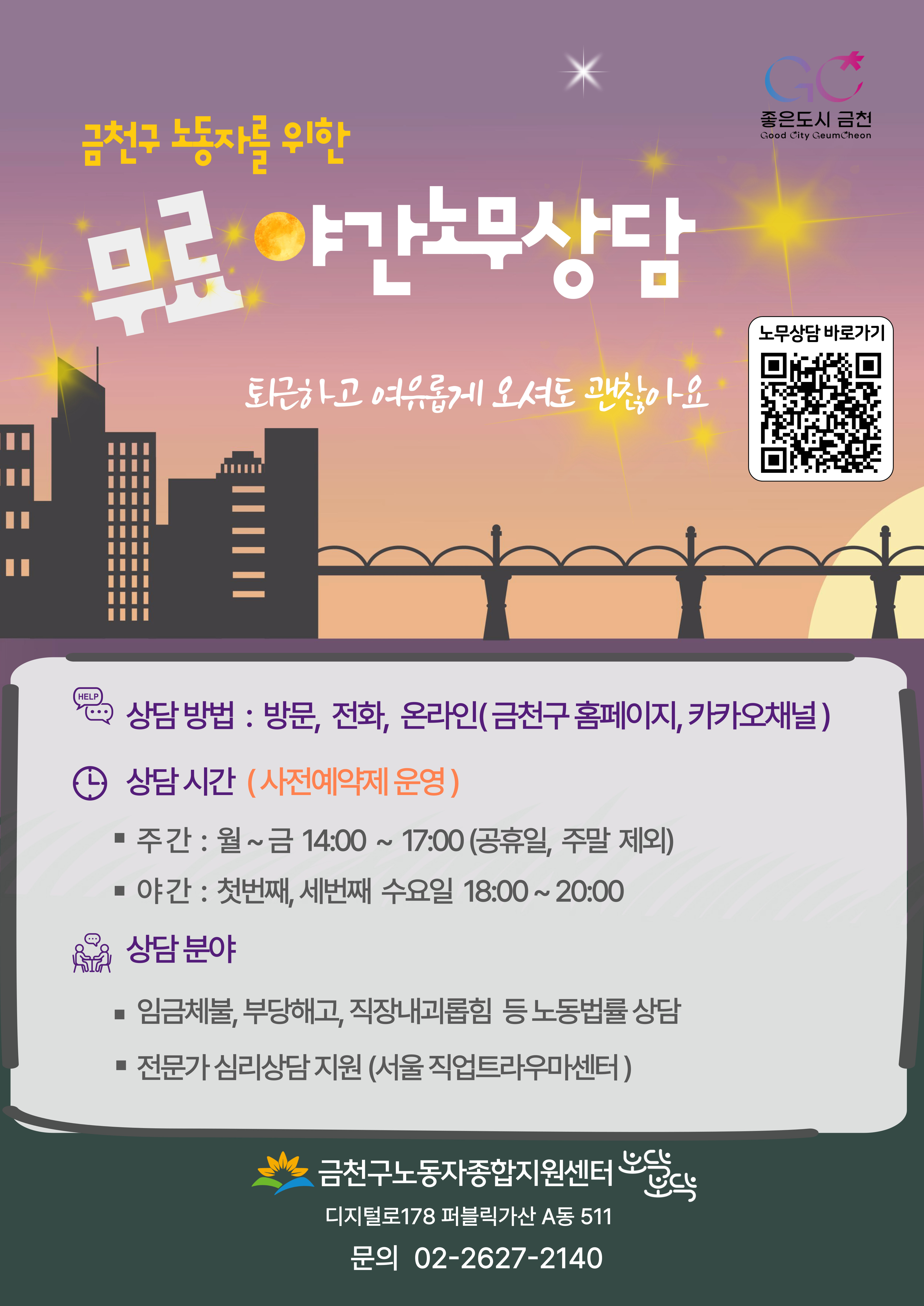 공지사항 홈 일자리/교육 금천구 노동자종합지원센터 센터소식 공지사항 점자뷰어보기 점자파일받기 인쇄 부가기능 토글 인스타그램 엑스 블로그 부가기능 닫기 센터소식 센터소개 센터소식 노동상담 안내 상담신청 상담신청(구) 공지사항 공지사항 센터소식 퇴근하고 여유롭게 무료 야간노무상담 받으세요 상세보기 - 제목,내용,파일 정보 제공 제목 퇴근하고 여유롭게 무료 야간노무상담 받으세요 파일 목록 이전글 무료노동상담 권리구제 지원사업 운영 다음글 금천 예술인 프리랜서 역량강화 교육 - 세무편