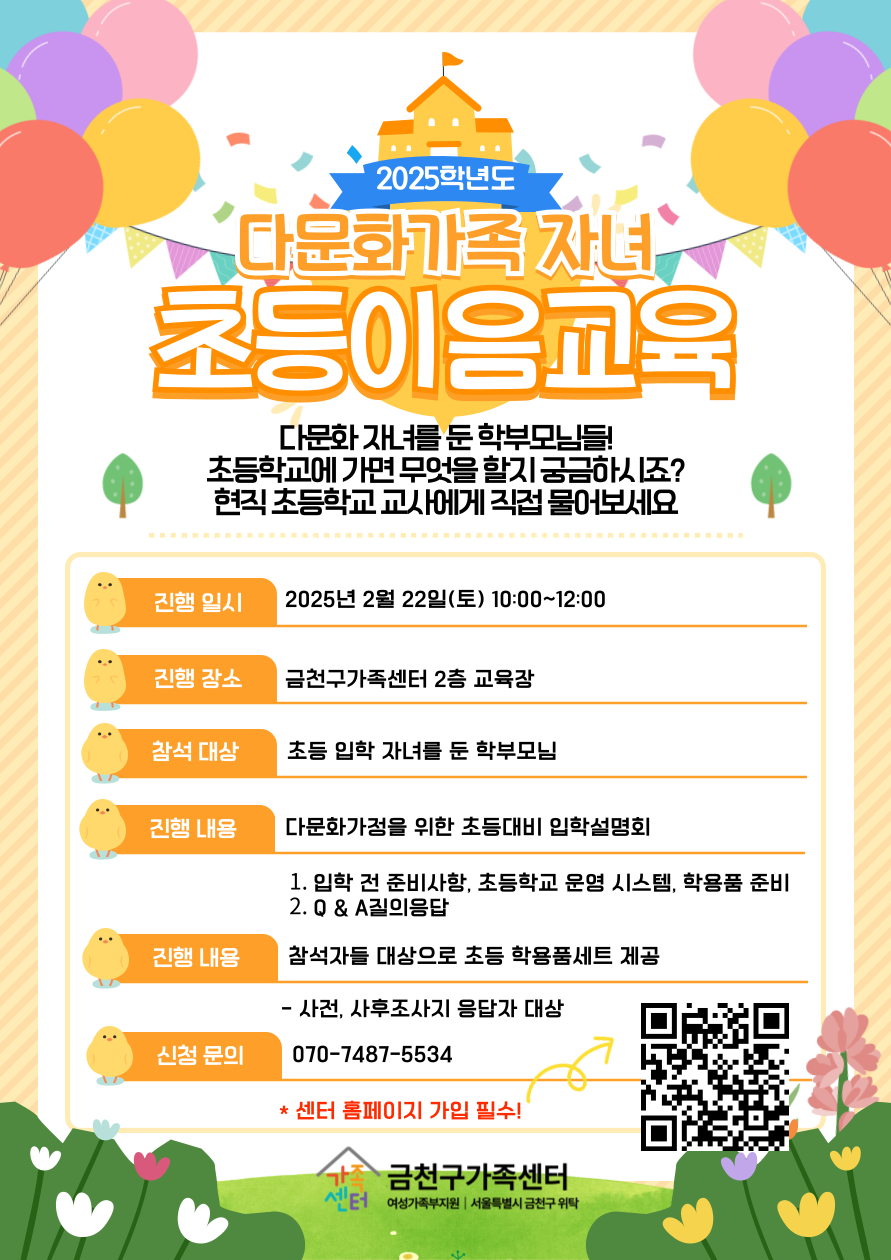 금천구가족센터에서 초등학교 입학 예정 자녀를 둔 다문화가족을 대상으로 입학 대비 교육 참여자를 모집하오니 많은 관심과 참여 부탁드립니다.