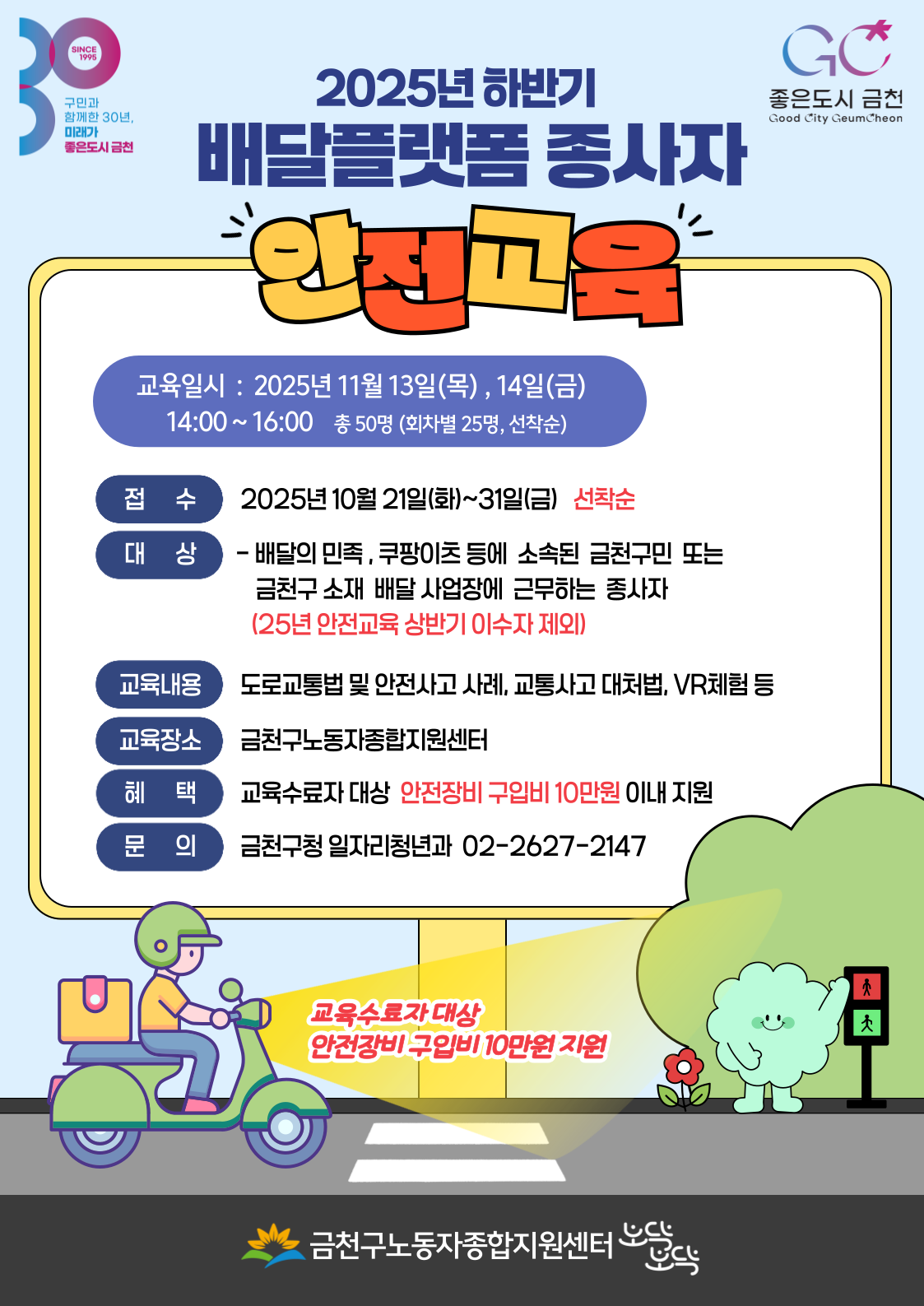 2025년 하반기 배달플랫폼종사자 안전교육(1차) 신청자:0/25명 , 대기자:0/15명 | |||